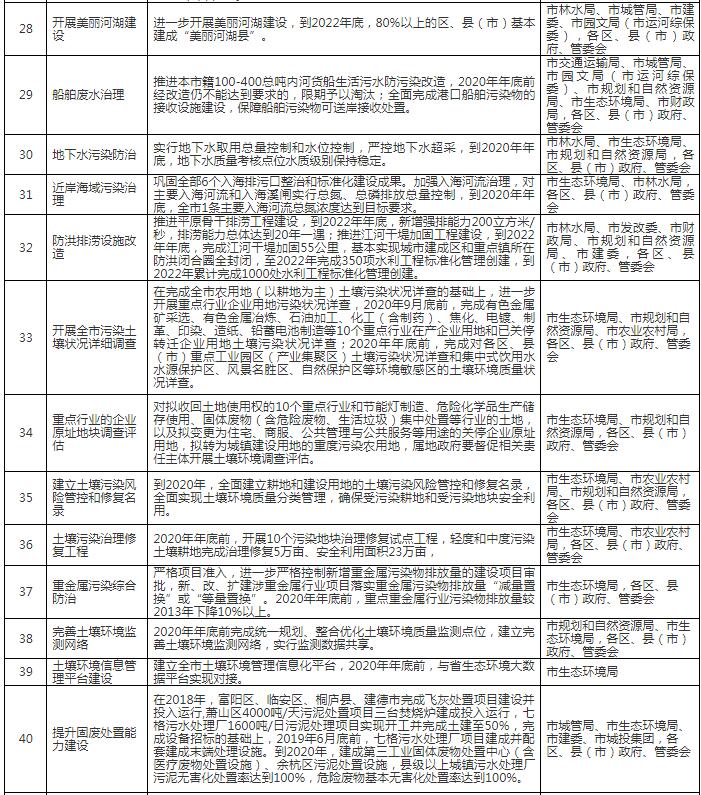 5.強化各類水體治理。進一步開展美麗河湖建設,到2022年年底,80%以上的區(qū)、縣(市)基本建成“美麗河湖縣”。加快船舶水治理,推進本市籍100-400總噸內(nèi)河貨船生活污水防污染改造,2020年年底前經(jīng)改造仍不能達到要求的,限期予以淘汰;全面完成港口船舶污染物的接收設施建設,保障船舶污染物可送岸接收處置。加強地下水污染防治,實行地下水取用總量控制和水位控制,嚴控地下水超采,到2020年年底,地下水質(zhì)量考核點位水質(zhì)級別保持穩(wěn)定。加強陸海統(tǒng)籌,深入推進近岸海域污染防治,鞏固全部6個入海排污口整治和標準化建設成果。加強入海河流治理,對主要入海河流和入海溪閘實行總氮、總磷排放總量控制,到2020年年底,全市1條主要入海河流總氮濃度達到目標要求。加強防洪排澇設施改造,推進平原骨干排澇工程建設,到2022年年底,新增強排能力200立方米/秒,排澇能力總體達到20年一遇;推進江河干堤加固工程建設,到2022年年底,完成江河干堤加固55公里,基本實現(xiàn)城市建成區(qū)和重點鎮(zhèn)所在防洪閉合圈全封閉;完成1000處水利工程標準化管理創(chuàng)建。