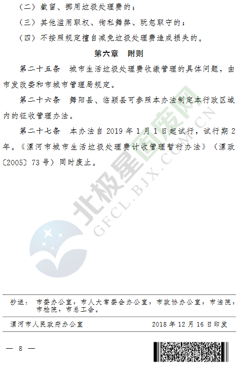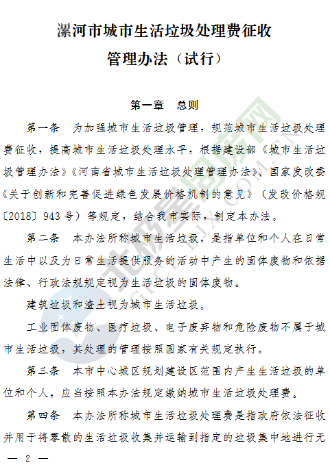 日前,《漯河市城市生活垃圾處理費(fèi)征收管理辦法(試行)》已經(jīng)河南漯河市政府第36次常務(wù)會議研究通過,并于2019年1月1日起試行。《漯河市城市生活垃圾處理費(fèi)征收管理辦法(試行)》是對《漯河市城市生活垃圾處理費(fèi)計(jì)收管理暫行辦法》(漯政〔2005〕73號)的完善修訂。
