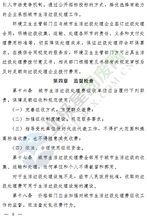答:國家建設(shè)部《城市生活垃圾管理辦法》及《河南省城市生活垃圾處理管理辦法》中規(guī)定:國家對城市生活垃圾的清掃、收集、運(yùn)輸和處理服務(wù)實(shí)行收費(fèi)制度。