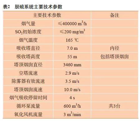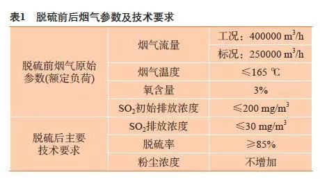 新建的130 T高溫超高壓高爐煤氣鍋爐排放的煙氣含硫最高200 mg/m3,粉塵5 mg/m3。根據(jù)當前國家環(huán)保的排放限值是:SO2 30 mg/m3和粉塵5 mg/m3,因此需要對排放煙氣設(shè)計脫硫方案(見表1),使排放煙氣SO2含量降到30 mg/m3以下,同時脫硫過程不得增加粉塵濃度,并且保證脫硫機組年穩(wěn)定運行時間≥8400 h,除霧器出口機械水含量≤75 mg/m3。