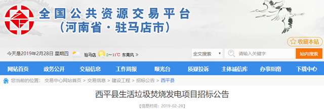 2019年2月28日,河南省駐馬店市西平縣生活垃圾焚燒發(fā)電項目發(fā)布招標(biāo)公告。