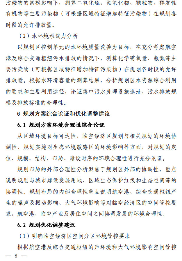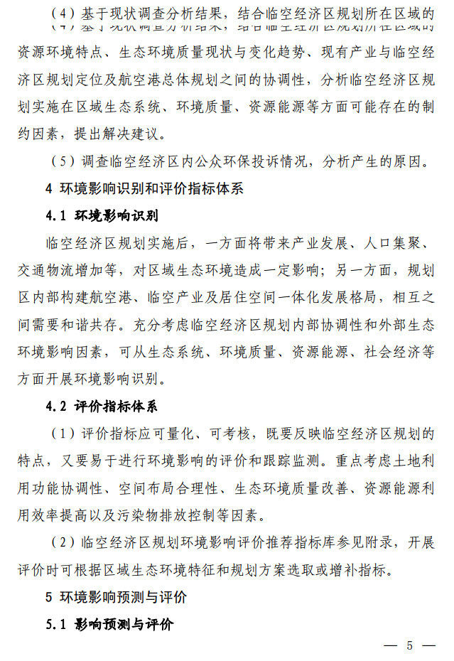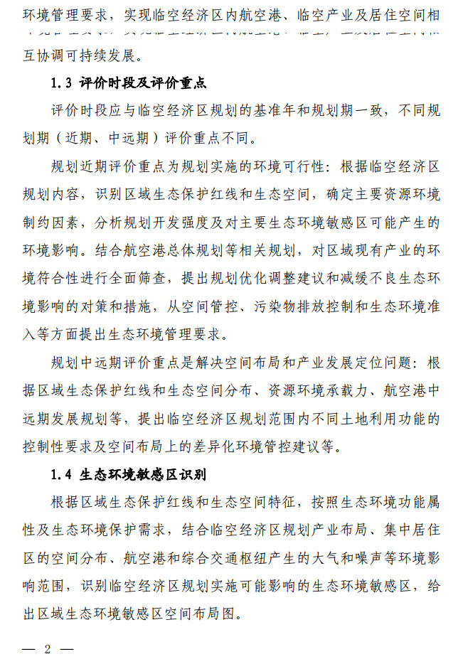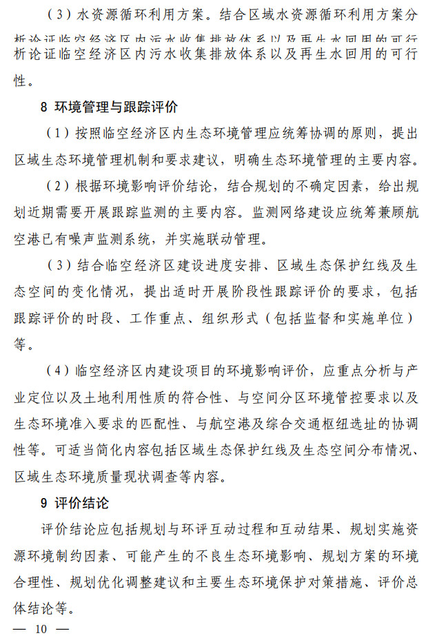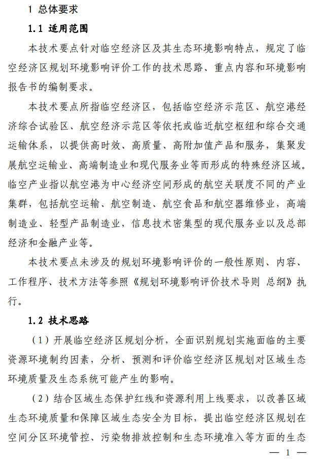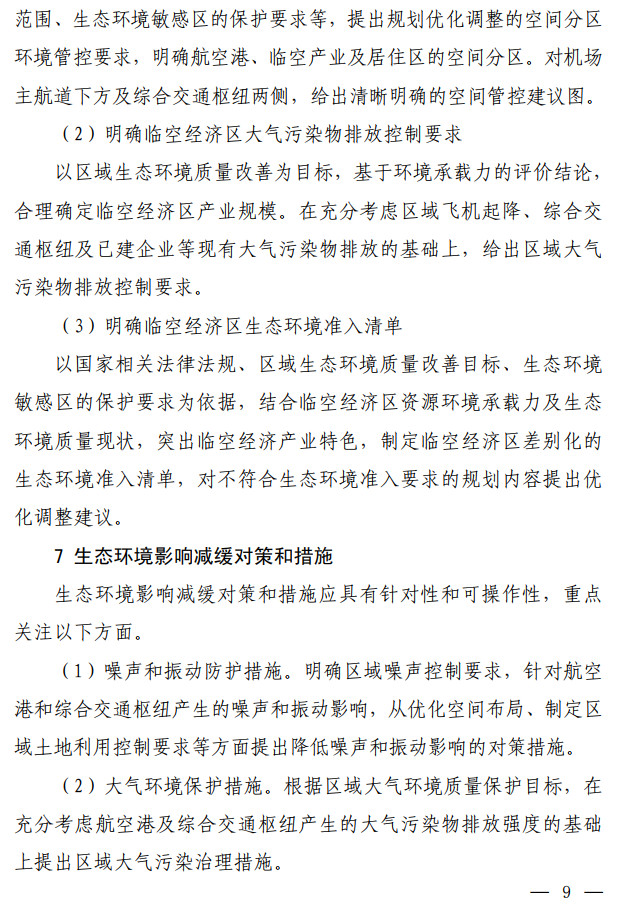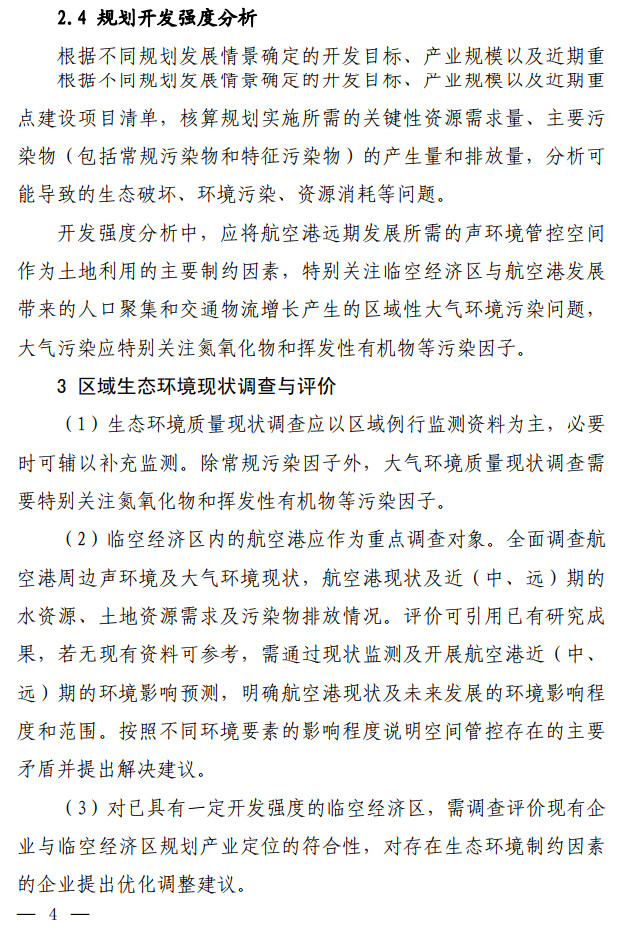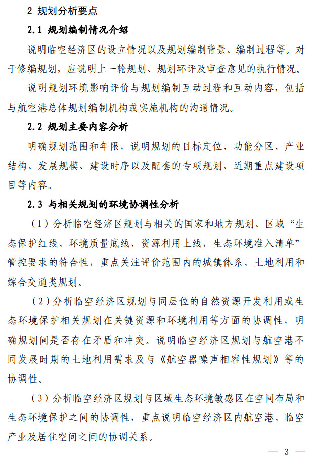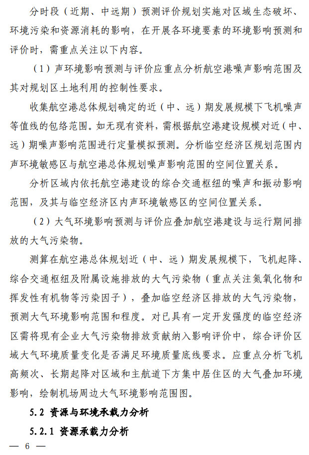 生態(tài)環(huán)境部發(fā)布了關(guān)于印發(fā)《臨空經(jīng)濟區(qū)規(guī)劃環(huán)境影響評價技術(shù)要點(試行)》的通知,該文件說明了全面調(diào)查航空港周邊聲環(huán)境及大氣環(huán)境現(xiàn)狀,航空港現(xiàn)狀及近(中、遠(yuǎn))期的水資源、土地資源需求及污染物排放情況。評價可引用已有研究成 果,若無現(xiàn)有資料可參考,需通過現(xiàn)狀監(jiān)測及開展航空港近(中、 遠(yuǎn))期的環(huán)境影響預(yù)測,明確航空港現(xiàn)狀及未來發(fā)展的環(huán)境影響程 度和范圍。按照不同環(huán)境要素的影響程度說明空間管控存在的主要矛盾并提出解決建議。全文如下: