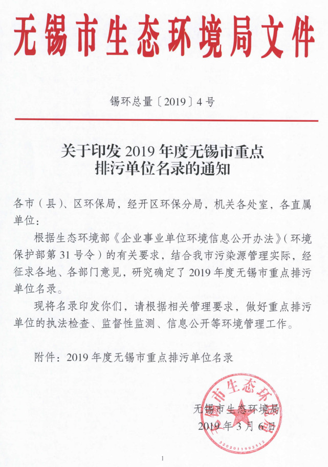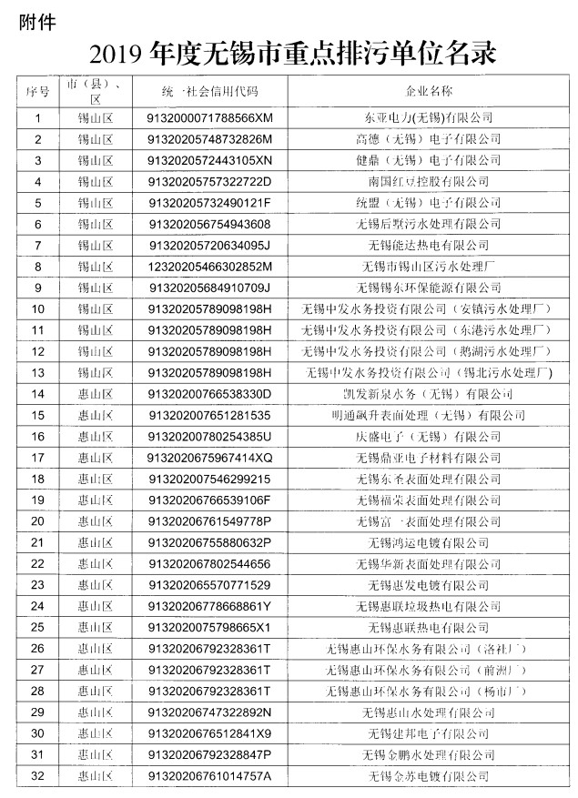 日前,無(wú)錫市發(fā)布2019年度無(wú)錫市重點(diǎn)排污單位名錄,包括眾多污水處理廠(chǎng)、鋼鐵企業(yè)、水泥企業(yè)、固體廢物處置企業(yè)等,全文如下: