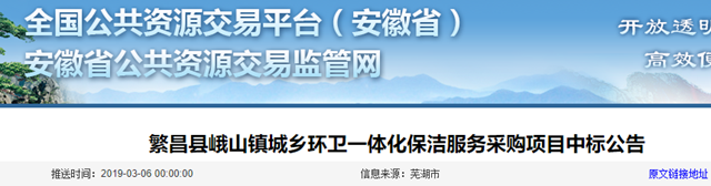 安徽省繁昌縣峨山鎮(zhèn)城鄉(xiāng)環(huán)衛(wèi)一體化保潔服務(wù)采購(gòu)項(xiàng)目發(fā)布中標(biāo)公告,蕪湖市鳩茲物業(yè)管理有限責(zé)任公司成為中標(biāo)社會(huì)資本方,中標(biāo)金額1001.43萬(wàn)(5年)。