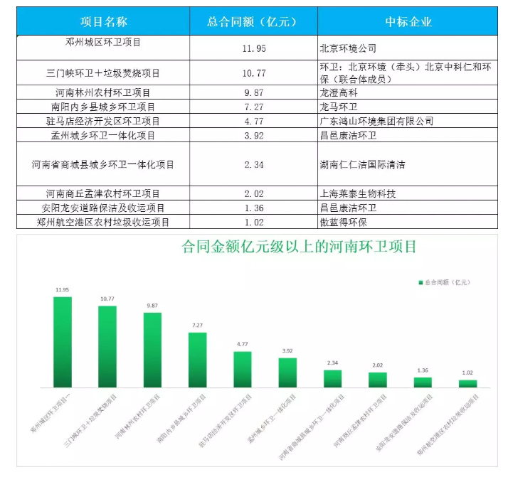 有的企業(yè)專(zhuān)攻大城市重點(diǎn)城區(qū)的一體化項(xiàng)目,比如北京環(huán)衛(wèi)集團(tuán)、龍馬環(huán)衛(wèi)、龍澄高科、昌邑康潔環(huán)衛(wèi)等,這些項(xiàng)目服務(wù)期限長(zhǎng),年服務(wù)費(fèi)和總合同金額也大,少則1-2億元,多則10億元以上。在大項(xiàng)目開(kāi)拓上,北京環(huán)衛(wèi)集團(tuán)略勝一籌,旗下的北京環(huán)境公司斬獲鄧州城區(qū)環(huán)衛(wèi)項(xiàng)目和三門(mén)峽環(huán)衛(wèi)+垃圾焚燒項(xiàng)目,總合同金額累計(jì)達(dá)22.72億元,按照本文開(kāi)端提到釋放60億元的訂單,僅北京環(huán)衛(wèi)集團(tuán)一家,便占據(jù)河南三分之一的市場(chǎng)。