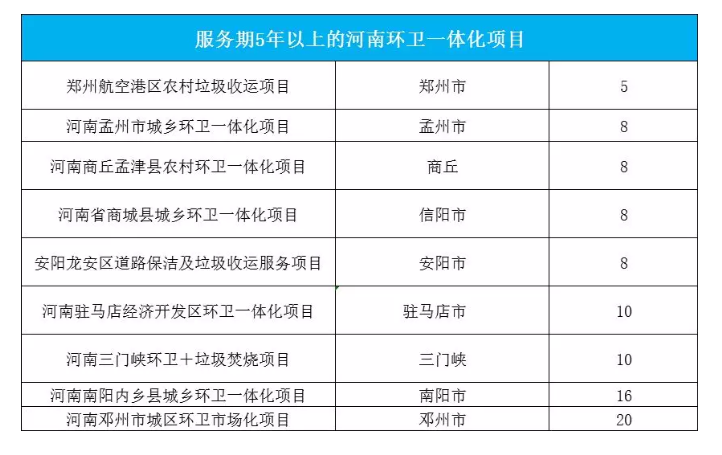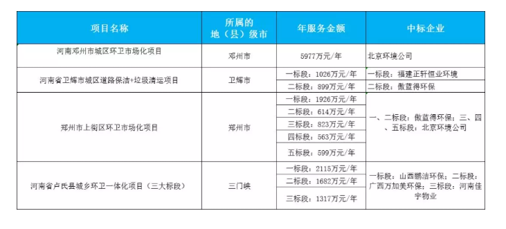同樣矚目還有林州環(huán)衛(wèi)項(xiàng)目、南陽(yáng)內(nèi)鄉(xiāng)縣環(huán)衛(wèi)項(xiàng)目、新蔡縣環(huán)衛(wèi)項(xiàng)目,年服務(wù)金額千萬(wàn)級(jí)以上,合同期限10年,總合同金額超過(guò)5億元。