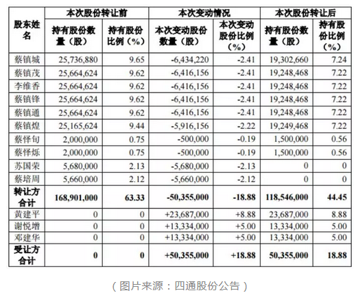 具體來看這次的股權(quán)轉(zhuǎn)讓方案,蘇國榮、蔡培周兩位股東屬于“清倉式”轉(zhuǎn)讓,兩者合計(jì)轉(zhuǎn)讓4.25%股份,這也是他們的全部的四通股份股權(quán);控股股東蔡鎮(zhèn)城等8人合計(jì)轉(zhuǎn)讓14.63%股份,每人轉(zhuǎn)讓比例在0.19%至2.41%之間不等。轉(zhuǎn)讓協(xié)議顯示,轉(zhuǎn)讓價(jià)格為9.12元/股,以3月8日的收盤價(jià)9.38元計(jì)算,本次轉(zhuǎn)讓折價(jià)幅度為2.77%。
