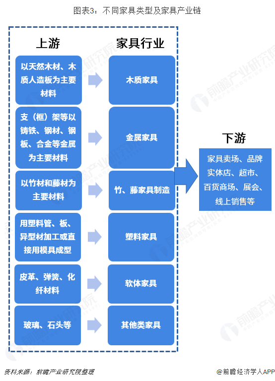 根據(jù)《國民經(jīng)濟(jì)產(chǎn)業(yè)分類》中,家具制造業(yè)是指用木材、金屬、塑料、竹、藤等材料制作的,具有坐臥、憑倚、儲藏、間隔等功能,可用于住宅、旅館、辦公室、學(xué)校、餐館、醫(yī)院、劇場、公園、船艦、飛機(jī)、機(jī)動車等任何場所的各種家具的制造。按照家具其主要使用材料進(jìn)行分類,包括木質(zhì)家具、金屬家具、竹藤家具、塑料家具及其他家具類型,其對應(yīng)的下游包括家具賣場、品牌實(shí)體店、超市、百貨商場、展會及線上銷售等。