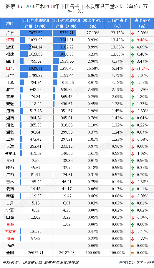 第二,與2010年相比,2018年全國木質(zhì)家具產(chǎn)量有所降低,但是大部分地區(qū)的產(chǎn)量有所增加,如江西、浙江、福建、四川等地區(qū);這主要是由于廣東和山東的木質(zhì)家具產(chǎn)量大幅下降,尤其是山東省;2010年山東和廣東的木質(zhì)家具產(chǎn)量份額均在27%上下,但是2018年山東省產(chǎn)量份額下降至5.34%。