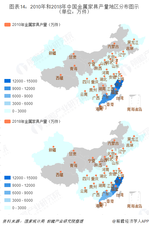 對比2010年和2018年各省市的金屬家具產(chǎn)量數(shù)據(jù)及分布圖示發(fā)現(xiàn)金屬家具產(chǎn)業(yè)遷移呈以下特點(diǎn)。