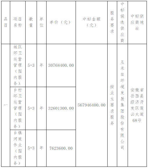 江西省尋烏縣城鄉(xiāng)環(huán)衛(wèi)全域一體化項(xiàng)目發(fā)布中標(biāo)結(jié)果公告,玉禾田環(huán)境發(fā)展集團(tuán)股份有限公司成為中標(biāo)的社會(huì)資本方,中標(biāo)金額為5.68億。