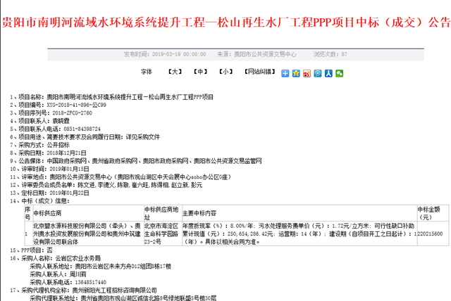 北京碧水源科技股份有限公司(牽頭)、貴州貴水投資發(fā)展股份有限公司和貴州中筑建設(shè)有限公司聯(lián)合體中標(biāo)貴陽(yáng)市南明河流域水環(huán)境系統(tǒng)提升工程—松山再生水廠工程PPP項(xiàng)目,中標(biāo)金額為22021.56萬(wàn)元。