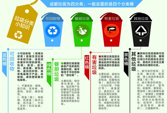 到2020年,成都將基本建立生活垃圾分類法規(guī)體系、政策體系、標(biāo)準(zhǔn)體系、設(shè)施體系和工作體系,形成以法治為基礎(chǔ)、政府推動(dòng)、全面參與、城鄉(xiāng)統(tǒng)籌、因地制宜的垃圾分類制度。