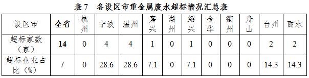 2018年存在監(jiān)測(cè)超標(biāo)的重金屬?gòu)U水重點(diǎn)排污單位共14家,其中寧波4家,溫州4家,臺(tái)州和麗水各2家,嘉興和紹興各1家。超標(biāo)行業(yè)為金屬制品業(yè)(超標(biāo)企業(yè)數(shù)8家),紡織業(yè)(2家),皮革、毛皮、羽毛(絨)及其制品業(yè)、有色金屬冶煉及壓延加工業(yè)、通用設(shè)備制造業(yè)和房地產(chǎn)業(yè)(各1家)。超標(biāo)的重金屬指標(biāo)為總鉻、總鎳、總鋁、總銅和六價(jià)鉻;超標(biāo)的非重金屬指標(biāo)為化學(xué)需氧量、氨氮、總氮、總磷、氯離子和氟化物。