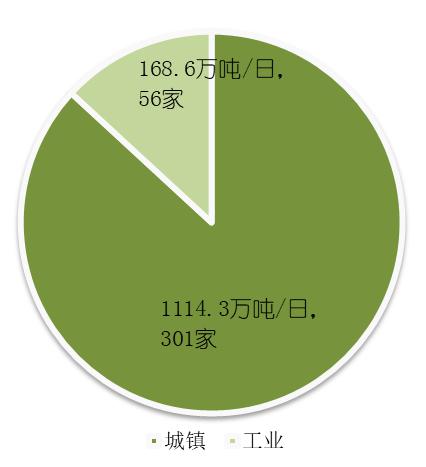 按設(shè)施類型,城鎮(zhèn)和工業(yè)污水廠分別為301家和56家,日處理水量為1114.3萬(wàn)噸和168.6萬(wàn)噸,運(yùn)行負(fù)荷分別為89.5%和68.2%。