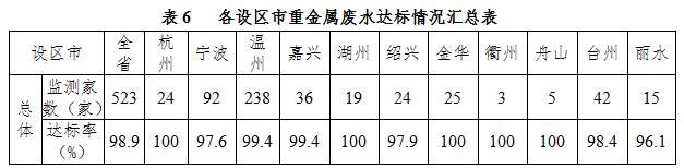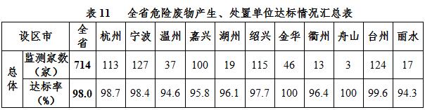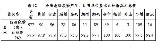 危險(xiǎn)廢物產(chǎn)生、處置單位中涉及廢水排放監(jiān)測(cè)577家,達(dá)標(biāo)率為97.9%。各設(shè)區(qū)市達(dá)標(biāo)率范圍為95.0-100%。金華、衢州和舟山達(dá)標(biāo)率為100%,其余8個(gè)設(shè)區(qū)市均出現(xiàn)了超標(biāo)現(xiàn)象。