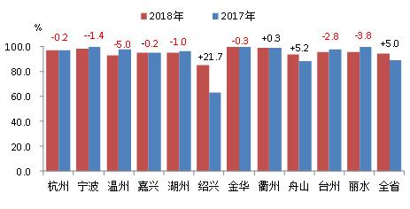 各設(shè)區(qū)市中,杭州、湖州、紹興、金華、衢州和舟山達(dá)標(biāo)率有所上升,升幅為0.2-11.6個(gè)百分點(diǎn),其他各市均有所下降,降幅為0.8-15.0個(gè)百分點(diǎn)。由于2018年開(kāi)始,全省城鎮(zhèn)污水處理廠均按照一級(jí)A標(biāo)準(zhǔn)進(jìn)行評(píng)價(jià),因此沿海地市達(dá)標(biāo)率降幅較大。