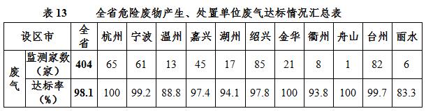 危險(xiǎn)廢物產(chǎn)生、處置單位中涉及廢氣排放404家,達(dá)標(biāo)率為98.1%。各設(shè)區(qū)市達(dá)標(biāo)率范圍為83.3-100%。杭州、金華和舟山達(dá)標(biāo)率為100%,其余8個(gè)設(shè)區(qū)市均出現(xiàn)了超標(biāo)現(xiàn)象。