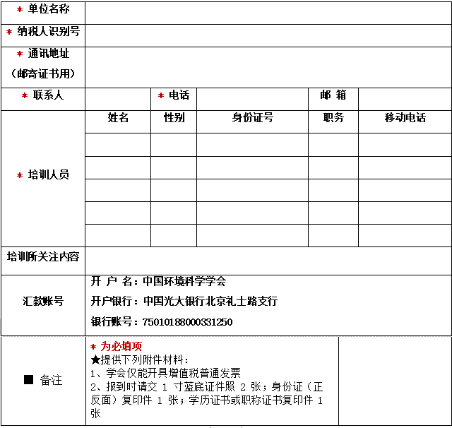 1、培訓(xùn)費(fèi)用:培訓(xùn)班收費(fèi) 3800元/每人,包括培訓(xùn)費(fèi)、資料費(fèi)、證書費(fèi)等。由中國環(huán)境科學(xué)學(xué)會(huì)收取培訓(xùn)費(fèi)并開具發(fā)票(一律開具增值稅普通發(fā)票),請?jiān)趨R款時(shí)備注“環(huán)境修復(fù)項(xiàng)目經(jīng)理”培訓(xùn)費(fèi)用(參加培訓(xùn)人員姓名),多位人員參加則在括號(hào)內(nèi)逐一填寫參加人員姓名,例:環(huán)境修復(fù)項(xiàng)目經(jīng)理培訓(xùn)費(fèi)(小明/小華/小雷)。住宿可統(tǒng)一安排,費(fèi)用自理。