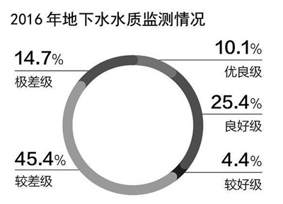 以地下水含水系統(tǒng)為單元,潛水為主的淺層地下水和承壓水為主的中深層地下水為對象的6124個地下水水質(zhì)監(jiān)測點(diǎn)中,水質(zhì)為優(yōu)良級、良好級、較好級、較差級和極差級的監(jiān)測點(diǎn)分別占10.1%、25.4%、4.4%、45.4%和14.7%。