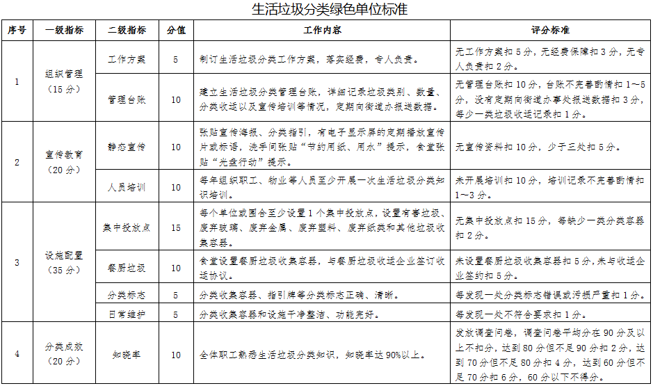“生活垃圾分類綠色單位”指開展生活垃圾分類且成效顯著的黨政機關、事業(yè)單位、學校、企業(yè)和社會組織,應具備以下條件: