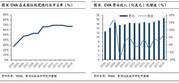 2004-2008 年間,CVA 快速崛起,市占率從 27%提升至 53%,成為美國垃圾 焚燒發(fā)電市場的龍頭。2010-2016 年這 7 年內 CVA 一直維持著近 70%的市占 率。2016 年,CVA 年垃圾處理能力約 2000 萬噸,占全美總年處理能力比重達到 67%。 2016 年底,CVA 擁有與經(jīng)營 45 個垃圾焚燒發(fā)電廠,此外公司還 有 11 個額外能源發(fā)電設施,包括木材生物質與水力再生能源發(fā)電設施、18 個 轉運站、12 個環(huán)境服務設施、1 個區(qū)域金屬回收設施和 4 個垃圾填埋場。CVA 的垃圾焚燒發(fā)電廠處理垃圾能力達到了 5.5 萬噸/日,年處理能力達到了 2000 萬噸,約占美國固廢年產(chǎn)生量 8%,占美國年垃圾焚燒量的 67%。