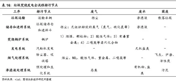 垃圾焚燒發(fā)電流程主要分為垃圾前端收集處理、垃圾發(fā)電以及末端煙氣、爐渣、 飛灰處理等。在項目運行過程中,會產(chǎn)生煙氣、滲濾液、飛灰、爐渣等污染物。 為減少生活垃圾焚燒造成的二次污染,環(huán)保部公布推出了《生活垃圾焚燒污染控制標準(GB18485-2001)》,替代國家環(huán)境保護總局發(fā)布的《上火垃圾焚燒污染控制標準(GWKB3-2000)》,并于 2014 年進行了修訂。