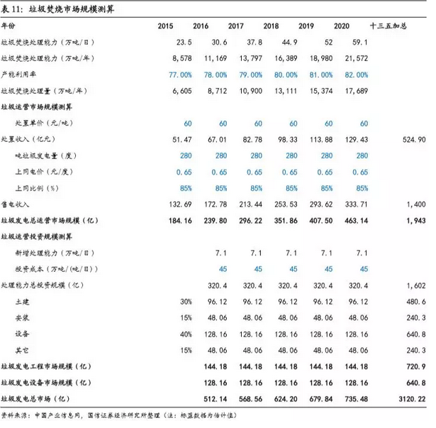 預計“十三五”期間,垃圾焚燒總市場規(guī)模達 3120 億?!丁笆濉比珖擎?zhèn)生 活垃圾無害化處理設施建設規(guī)劃》提出,到 2020 年全國垃圾焚燒處理能力達 到 59.14 萬噸/日,占無害化處理能力的比例達到 54%。1)根據(jù)國家“十三 五規(guī)劃”,假設 2016-2020 年每年新增 7.1 萬噸/日焚燒處理能力,項目產(chǎn)能利 用率 80%、噸垃圾處置費 60 元/噸、噸垃圾發(fā)電量 280 度、上網(wǎng)電價 0.65 元/ 度、上網(wǎng)比例 85%,則垃圾焚燒發(fā)電運營市場規(guī)模將達到 1943 億。2)假設噸 垃圾投資額 45 萬/(噸/日),則對應 2016-2020 年每年垃圾焚燒總投資約 320億。假設焚燒發(fā)電項目投資中,土建、安裝、設備及其它分別占總投資的比例 為 30%、15%、40%、15%,則 2016-2020 年垃圾發(fā)電工程市場規(guī)模為 144 億,設備市場規(guī)模為 128 億,十三五期間垃圾焚燒發(fā)電總工程就設備市場規(guī)模 分別為 721 億、641 億。綜合考慮工程、設備及運營市場,“十三五”期間垃圾 焚燒總市場規(guī)模達到 3120 億。