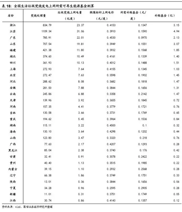 垃圾焚燒發(fā)電企業(yè)所產(chǎn)生的上網(wǎng)電量可以實現(xiàn)全部上網(wǎng),由電力部門全額收購。電 價政策方面,2012 年 3 月 28 日,國家發(fā)改委發(fā)布《國家發(fā)展改革委關于完善垃 圾焚燒發(fā)電價格政策的通知》,要求“以生活垃圾為原料的垃圾焚燒發(fā)電項目,均 先按其入廠垃圾處理量折算成上網(wǎng)電量進行結算,每噸生活垃圾折算上網(wǎng)電量暫定 為280 千萬時,并執(zhí)行全國統(tǒng)一垃圾發(fā)電標桿電價每千瓦時0.65 元(含稅);其余 上網(wǎng)電量執(zhí)行當?shù)赝惾济喊l(fā)電機組上網(wǎng)電價”。該通知自2012年4月1日執(zhí)行, 2006 年1 月 1 日后核準的垃圾焚燒發(fā)電項目均按該規(guī)定執(zhí)行。 針對市場擔憂的生活垃圾焚燒發(fā)電上網(wǎng)電價下調的風險,我們對垃圾焚燒發(fā)電上網(wǎng) 電價補貼占可再生能源基金支出的占比情況進行了分析: ? 根據(jù)《國家發(fā)展改革委關于完善垃圾焚燒發(fā)電價格政策的通知》,垃圾焚燒發(fā) 電上網(wǎng)電價高出當?shù)孛摿蛉济簷C組標桿上網(wǎng)電價的部門實行兩級分攤。其中, 當?shù)厥〖夒娋W(wǎng)負擔每千瓦時 0.1 元,電網(wǎng)企業(yè)由此增加的購電成本通過銷售電 價予以疏導;其余部分納入全國征收的可再生能源電價附加解決。 ? 按照 2016 年各省垃圾焚燒處置量,噸垃圾上網(wǎng)電量 280 度測算,全國垃圾焚 燒發(fā)電上網(wǎng)需要可再生能源補貼基金 32 億。 ? 財政部 2016年財政決算支出中,可再生能源電價附加收入安排支出共595.06 億。 垃圾焚燒發(fā)電所需的補貼基金在國家可再生能源補貼基金中占比僅 5.4%。目前 全國各地仍處于垃圾焚燒處置占比急需提升的階段,且垃圾焚燒發(fā)電的垃圾減 量化效果明顯,是化解“垃圾圍城”問題的重點途徑,因此我們認為短期垃圾 焚燒上網(wǎng)電價補貼下調的可能性很小。