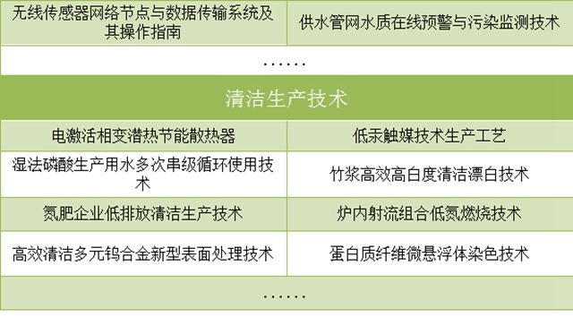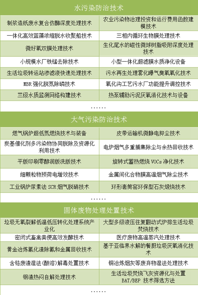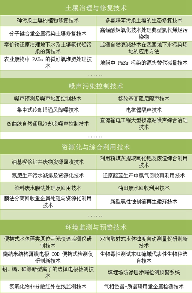 從制漿造紙廢水復(fù)合仿酶深度處理技術(shù)、小型一體化超濾膜水質(zhì)凈化設(shè)備、炭基催化劑多污染物協(xié)同脫除及資源化利用技術(shù)、環(huán)形套筒窯環(huán)保型石灰煅燒技術(shù)、垃圾無氧裂解低溫低壓轉(zhuǎn)化處理系統(tǒng)產(chǎn)業(yè)化,到分子鍵合重金屬污染土壤修復(fù)技術(shù)、噪聲預(yù)測(cè)及噪聲地圖繪制技術(shù)、氮肥生產(chǎn)污水減排及資源化技術(shù)、雙向散射式水體濁度自動(dòng)測(cè)量儀研制新技術(shù)、電激活相變潛熱節(jié)能散熱器......