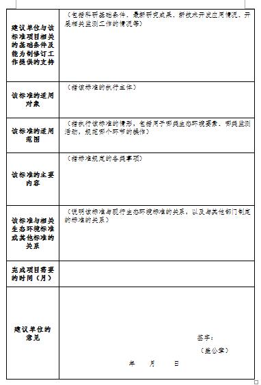 請(qǐng)?zhí)顚懖⑻峤桓郊械纳鷳B(tài)環(huán)境監(jiān)測(cè)標(biāo)準(zhǔn)制修訂建議表,每個(gè)建議表限填一個(gè)項(xiàng)目,建議表一式2份,應(yīng)由法定代表人(或委托授權(quán)人)簽字并加蓋公章。同時(shí)提交標(biāo)準(zhǔn)文本和編制說明,格式和內(nèi)容要求參照《環(huán)境監(jiān)測(cè) 分析方法標(biāo)準(zhǔn)制修訂技術(shù)導(dǎo)則》(HJ168-2010),分析方法類標(biāo)準(zhǔn)建議還應(yīng)提交驗(yàn)證、比對(duì)的數(shù)據(jù)結(jié)果。
