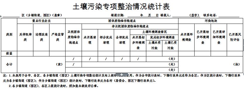 (三)嚴格執(zhí)行登記制度。各區(qū)要按照方案要求,按時完成各項工作,于6月30日前向市環(huán)保局報送土壤質(zhì)量與修復規(guī)劃;7月15日前向市環(huán)保局報送各類登記表(附件1);11月30日前向市環(huán)保局報送各類花名冊(附件2)和土壤污染專項整治情況統(tǒng)計表(附件3)。同時向市市容園林委報送涉及城鎮(zhèn)生活垃圾相關內(nèi)容,向市農(nóng)委報送涉及村莊內(nèi)生活垃圾相關內(nèi)容。