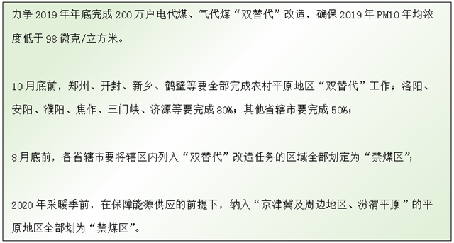 河南省發(fā)改委印發(fā)的2019年大氣污染防治攻堅(jiān)戰(zhàn)推進(jìn)方案中也提到,新增天然氣量優(yōu)先用于城鎮(zhèn)居民的生活和冬季取暖散煤替代。此外,明確2019年全省煤炭消費(fèi)總量控制在2.1億噸以內(nèi),完成“雙替代”80萬戶,加快淘汰落后煤電產(chǎn)能。