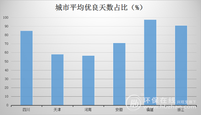 2018年,四川省94個城市平均優(yōu)良天數(shù)占比84.8%,9個市農(nóng)村區(qū)域優(yōu)良比例為89.6%;天津市達(dá)標(biāo)天數(shù)207天,占比58.1%;河南省優(yōu)良天數(shù)比例56.6%,首要污染物為PM2.5;