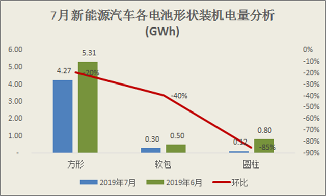 高工產(chǎn)業(yè)研究院(GGII)通過最新發(fā)布的《動力電池月度數(shù)據(jù)庫》統(tǒng)計顯示,2019年7月我國新能源汽車生產(chǎn)約7.4萬輛,同比下降6%,環(huán)比下降43%;動力電池裝機總電量約4.70GWh,同比增長40%,環(huán)比下降29%。