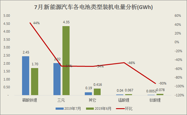 從7月各類型電池裝機量來看,僅磷酸鐵鋰依舊保持環(huán)比上漲勢頭,環(huán)比增長44%。三元、錳酸鋰、鈦酸鋰三元電池均環(huán)比下跌,其中三元環(huán)比下滑54%,錳酸鋰環(huán)比下滑46%,鈦酸鋰環(huán)比下滑93%。