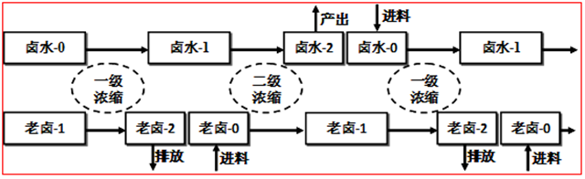 如上圖所示,老鹵和鹵水分別在正滲透膜的兩側(cè)循環(huán)流動(dòng),利用正滲透膜選擇性透過的特性,以膜兩側(cè)滲透壓差作為驅(qū)動(dòng)力,將水從鹵水側(cè)遷移到老鹵側(cè),從而達(dá)到鹵水濃縮的目的。在實(shí)驗(yàn)中,濃縮過程分兩步進(jìn)行:首先以稀釋過的老鹵(老鹵-1)作為驅(qū)動(dòng)液對(duì)納濾產(chǎn)水(鹵水-0)進(jìn)行一級(jí)濃縮,濃縮過程中膜通量會(huì)逐漸減小,到達(dá)預(yù)定值時(shí),停止?jié)饪s得到鹵水-1;然后以新的老鹵(老鹵-0)對(duì)鹵水-1進(jìn)行二級(jí)濃縮,得到老鹵-1和最終產(chǎn)物鹵水-2,如圖4所示。