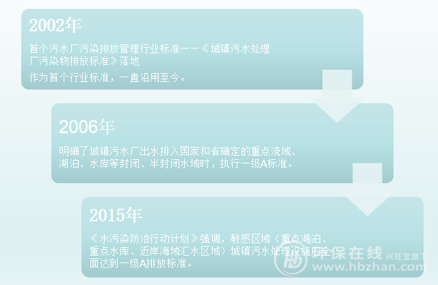 在地表水環(huán)境質(zhì)量標(biāo)準(zhǔn)中,對(duì)地表Ⅳ類有24類指標(biāo),對(duì)污水處理廠出水最重要的是COD、BOD、氨氮、總氮和總磷五項(xiàng)指標(biāo)。尤其是《城鎮(zhèn)污水處理廠污染物排放標(biāo)準(zhǔn)》,帶動(dòng)我國污水處理廠從二級(jí)常規(guī)生物處理發(fā)展為具有脫氮除磷功能的二級(jí)強(qiáng)化處理工藝。下圖所列為近年來污水處理廠排放標(biāo)準(zhǔn)變革過程: