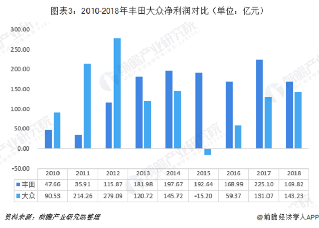 近幾年,盡管在汽車銷量上豐田不及大眾,可吸金能力不容小覷。2016-2017年豐田銷量均少于大眾,可營(yíng)收均在大眾之上;2018年大眾以57.3億元的微弱優(yōu)勢(shì)領(lǐng)先。從凈利潤(rùn)情況來看,豐田盈利較為穩(wěn)定,領(lǐng)先優(yōu)勢(shì)較大,2013-2018年豐田凈利均高于大眾。2019年大眾和豐田分列世界500強(qiáng)第九位和第十位。