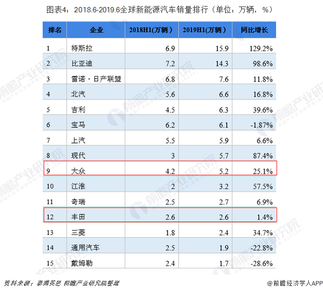 未來雙方的主戰(zhàn)場(chǎng)將會(huì)逐漸從燃油車往新能源領(lǐng)域轉(zhuǎn)移。泰博英思數(shù)據(jù)顯示,2019年上半年,全球新能源汽車銷量為107.69萬(wàn)輛,排名前十的企業(yè)占全球總銷量的71%。冠軍由美國(guó)汽車品牌特斯拉所得,接著是以14.3萬(wàn)輛排名第二的比亞迪,這名來自中國(guó)的選手在此之前已連續(xù)4年霸占新能源汽車銷量冠軍寶座。大眾和豐田分列第九位和第十二位,大眾的銷量是豐田的2倍。