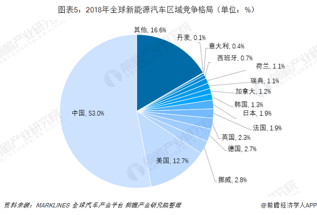 在全球范圍內(nèi),新能源汽車都圍繞著中國(guó)展開研發(fā),因?yàn)橹袊?guó)是全球最大的新能源汽車市場(chǎng),新能源汽車的絕大部分銷量都來自中國(guó)。2018年,中國(guó)新能源汽車銷售占全球新能源汽車銷量的53%;其次是美國(guó),大約占12.7%;另外,挪威(2.8%)、德國(guó)(2.7%)、英國(guó)(2.3%)、法國(guó)(1.9%)、日本(1.9%)、韓國(guó)(1.3%)。