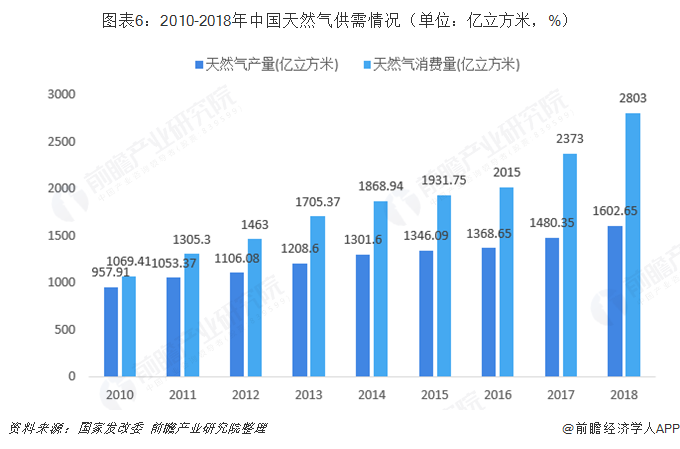 2018年,我國天然氣產量約1603億立方米,同比增長8.3%,增幅達6個百分點,主要原因是環(huán)保政策的落實推進,使天然氣消費需求持續(xù)攀升,帶動產量大幅提高。2018年,在全國經(jīng)濟平穩(wěn)發(fā)展、結構調整與轉型升級持續(xù)推進的作用下,全年天然氣消費超預期增長,消費量達到2803億立方米。同比增長18.1%,創(chuàng)下增速世界紀錄。