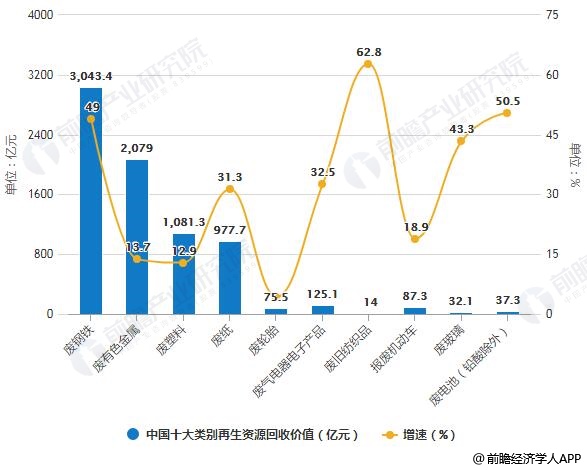 2017年中國十大類別再生資源回收價值統(tǒng)計及增長情況