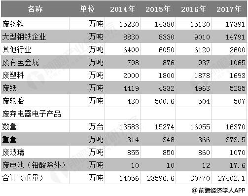 2014-2017年前八大類別再生資源回收總量統(tǒng)計情況