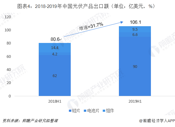 與此同時,2019年上半年中國光伏產(chǎn)品出口額達(dá)到106.1億美元,同比增長31.7%。其中硅片、電池片、組件出口量均實現(xiàn)了同比增長,分別為23.6億片(約11.6GW)、5.3GW、36GW,同比分別增長1.2%、157.9%和102.4%,其中電池片的出口量超過了2018年全面增長量。