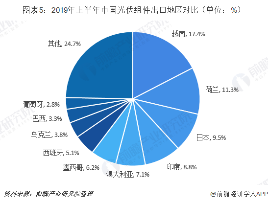 隨著歐洲市場復(fù)蘇,2019年上半年出口到荷蘭、西班牙、烏克蘭、葡萄牙、德國、比利時的組件明顯增加。此外,越南超越印度成為中國光伏產(chǎn)品出口第一大市場,主要原因在于越南總理簽發(fā)關(guān)于在越南發(fā)展太陽能發(fā)電項目鼓勵機制的決定。