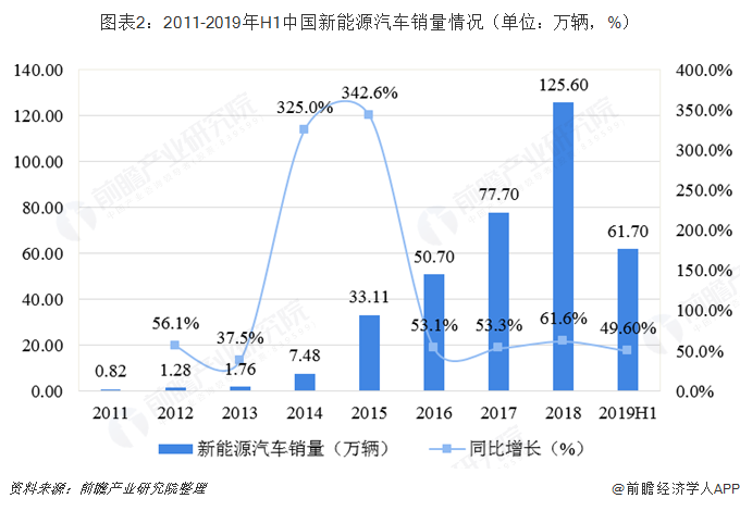從銷售端來看,2018年,我國新能源汽車行業(yè)發(fā)展迅速,銷量突破120萬。中國汽車工業(yè)協(xié)會統(tǒng)計數(shù)據(jù)顯示,2018年我國新能源汽車銷量125.6萬輛,同比增長61.6%。我國新能源汽車銷量從2011年的0.82萬輛到2018年的125.6萬輛,實現(xiàn)了跨越式發(fā)展。新的數(shù)據(jù)顯示,2019年上半年,我國新能源汽車銷量為61.7萬輛,同比增長49.6%。