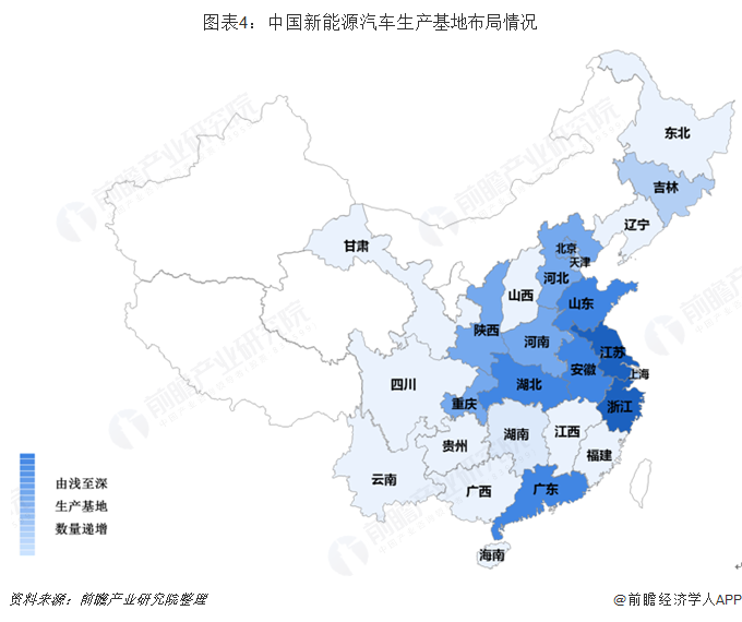 目前,我國華東地區(qū)有著數(shù)量多的新能源汽車生產(chǎn)基地,主要集中在江蘇、浙江、安徽、山東這四個省份;華中地區(qū)新能源汽車生產(chǎn)基地主要集中在湖北省;華南地區(qū)新能源汽車生產(chǎn)基地主要集中在廣東省;西北地區(qū)的新能源汽車生產(chǎn)基地主要集中在陜西省;西南地區(qū)新能源汽車生產(chǎn)基地集中在重慶。新能源汽車生產(chǎn)基地越密集的地區(qū)代表了該地的新能源汽車生產(chǎn)能力較強。