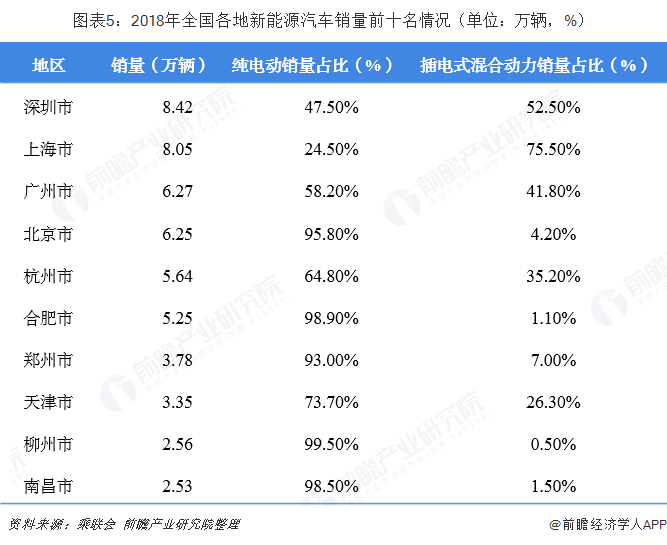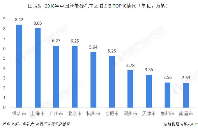但在市場需求上,我國新能源汽車行業(yè)銷售集中在北上廣深這四大一線城市。根據(jù)全國乘用車聯(lián)合會監(jiān)測零售數(shù)據(jù)顯示,2018年我國新能源汽車銷量前十城市份額占全國的54.7%,其中北上廣深四大一線城市包攬全國新能源汽車銷量前四名。