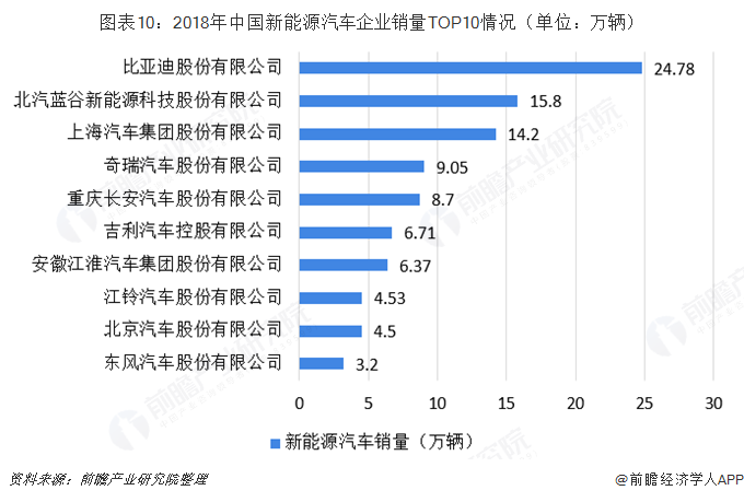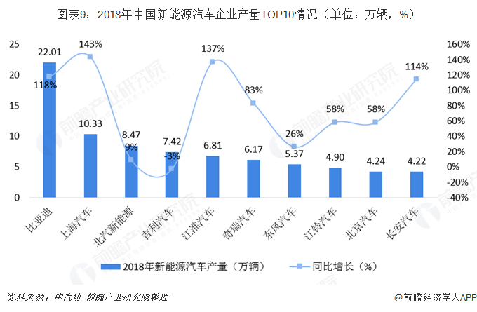 根據(jù)中國汽車工業(yè)協(xié)會數(shù)據(jù)顯示,2018年全國新能源汽車產(chǎn)量前三家車企分別為比亞迪(22.01萬輛)、上汽集團(10.33萬輛)和北汽新能源(8.47萬輛),全國新能源汽車產(chǎn)量前十家車企的產(chǎn)量達到80萬輛,占比高達60%以上。